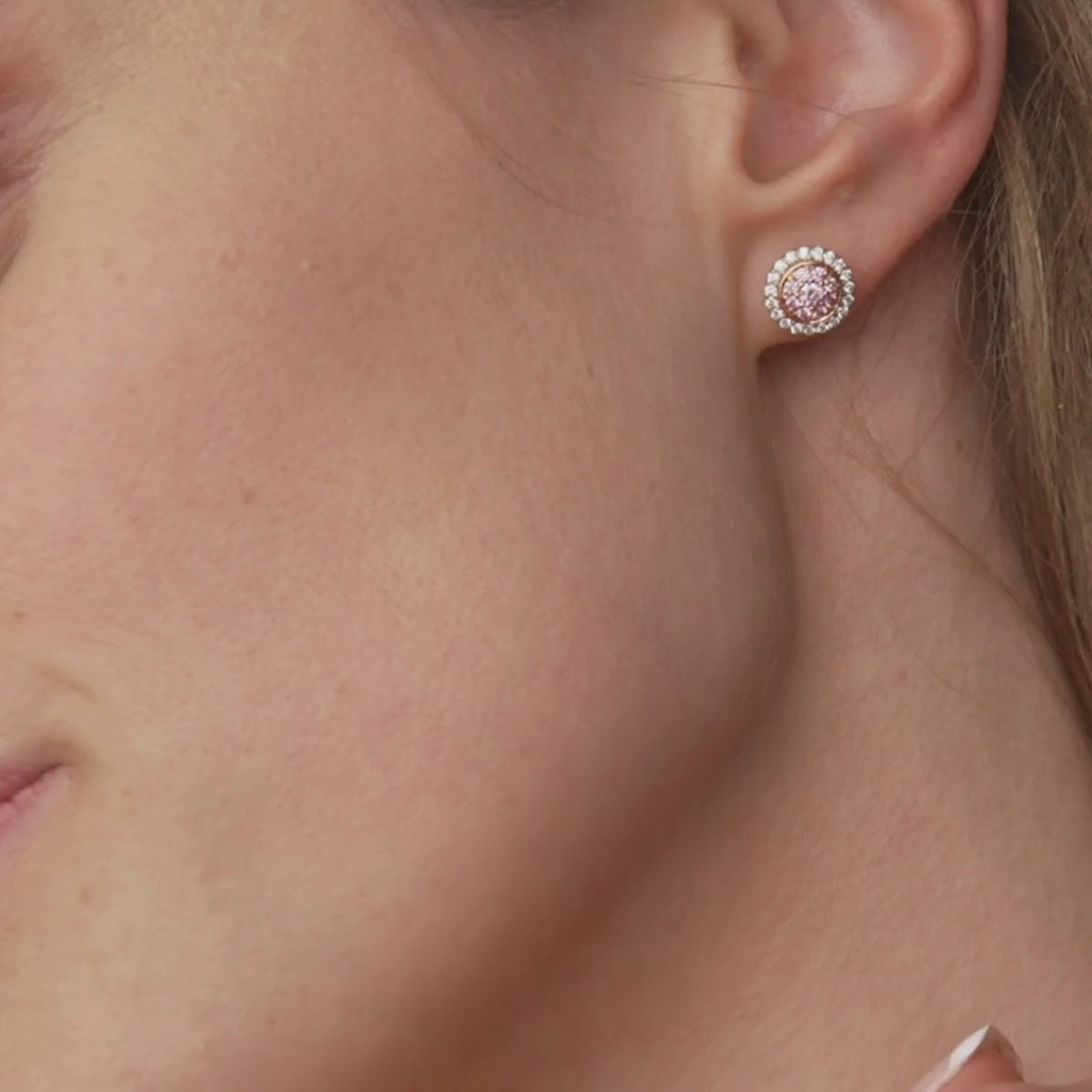 This striking halo design boasts a rare matching pair of Argyle pink diamonds in the centre surrounded by contrasting white accent diamonds, all set tightly together in discrete shared prongs for a soft brilliant effect. The earrings are handcrafted in either platinum or 18ct gold.